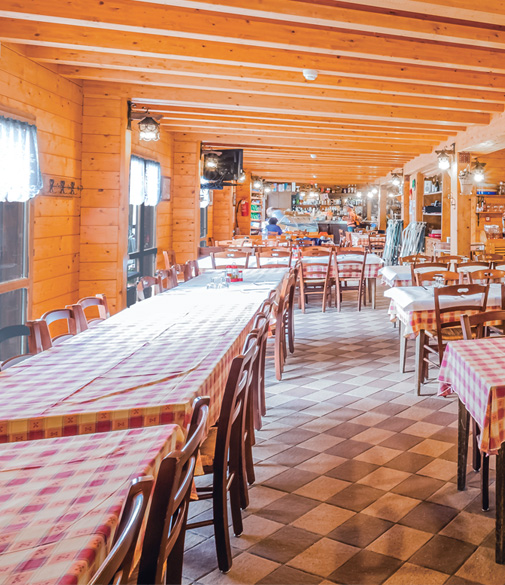 La sala da pranzo interna del Rifugio può arrivare ad ospitare fino a quasi cento coperti, l’area bar offre circa venti posti a sedere mentre la terrazza esterna può accogliere più di 30 persone. Ti aspettiamo per invitanti pranzi, saporite cene da gustare e condividere in compagnia nella suggestiva cornice delle Alpi Orobie.